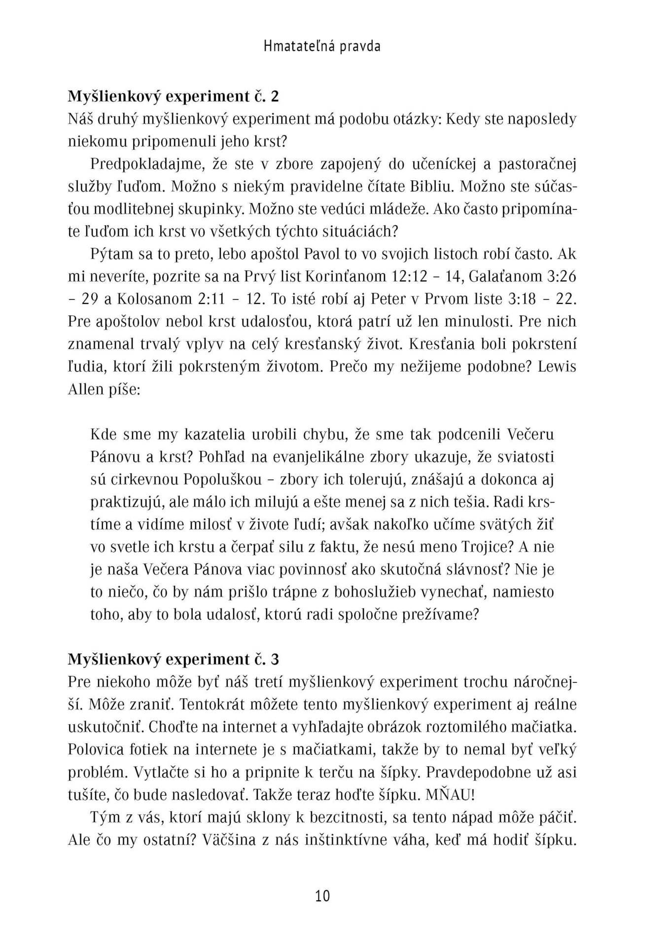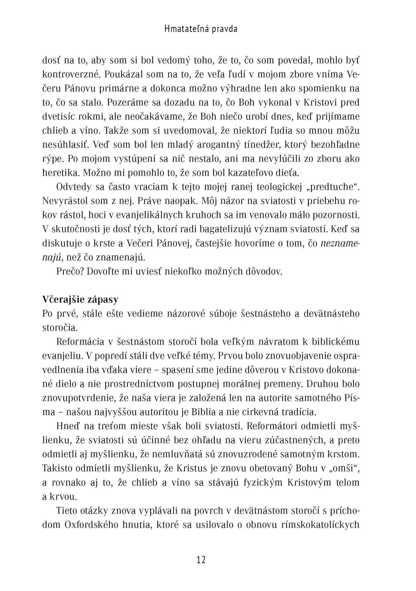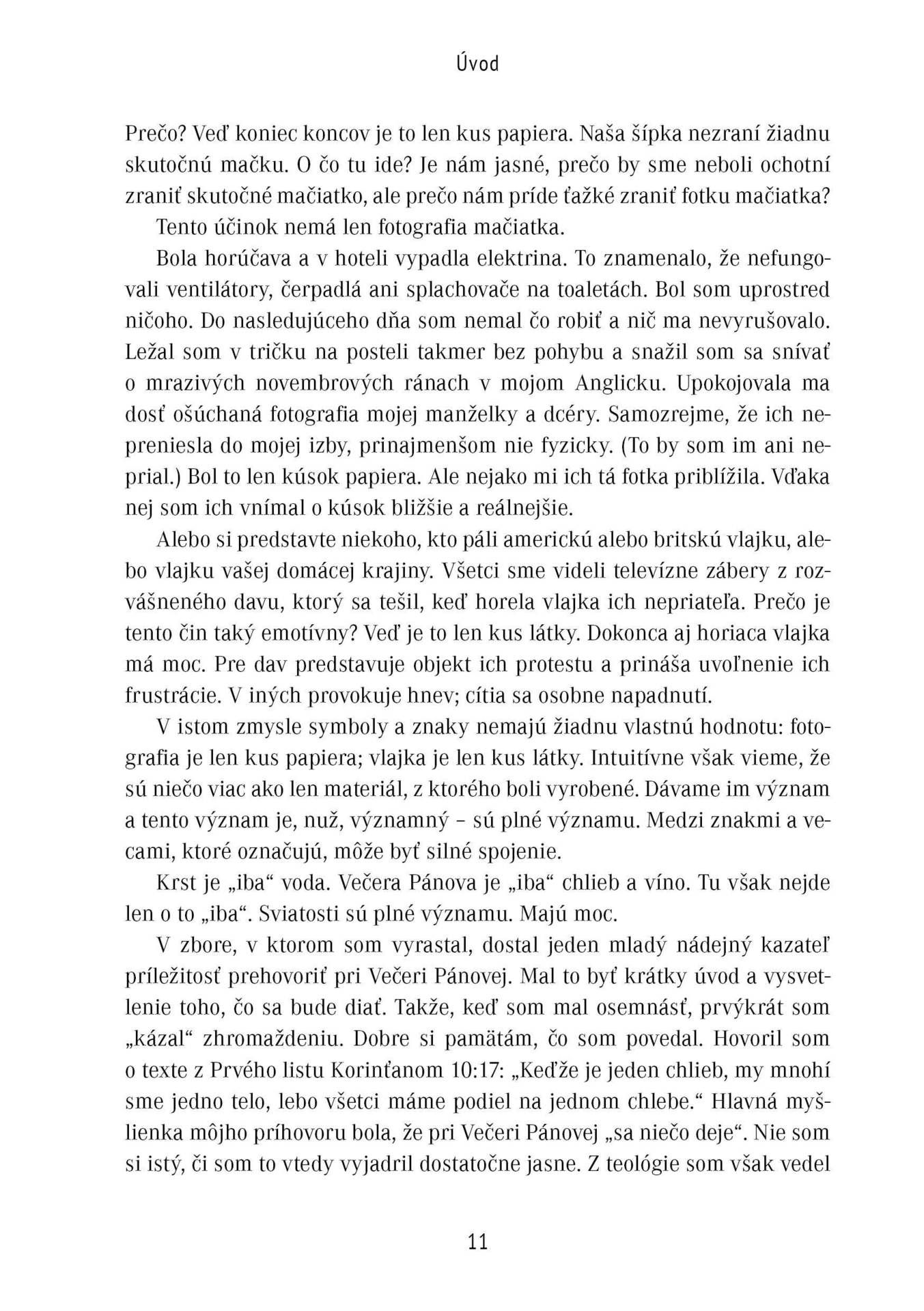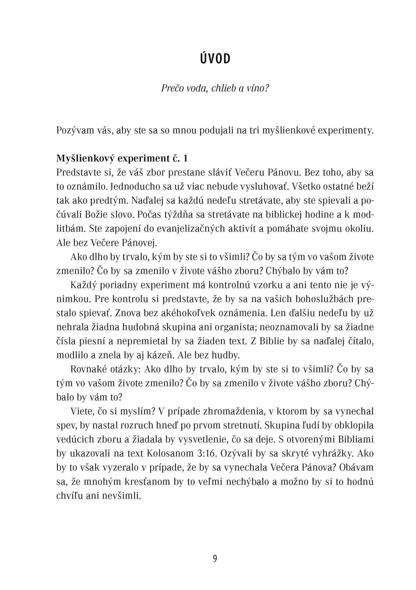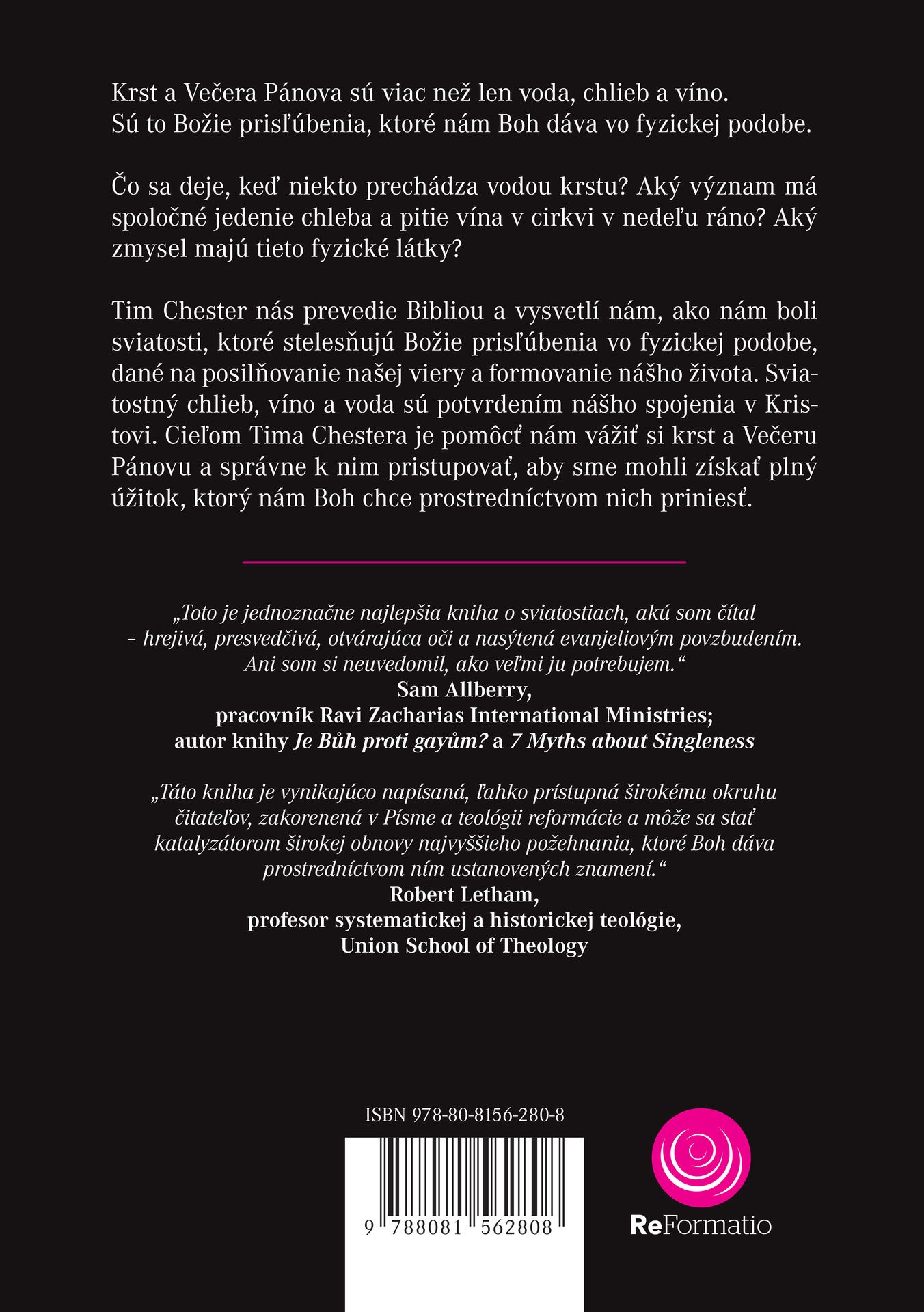 Tim Chester nás prevedie Bibliou a vysvetlí nám, ako nám boli sviatosti, ktoré stelesňujú Božie prisľúbenia vo fyzickej podobe, dané na posilňovanie našej viery a formovanie nášho života. Sviatostný chlieb, víno a voda sú potvrdením nášho spojenia v Kristovi. Cieľom autora je pomôcť nám vážiť si krst a Večeru Pánovu a správne k nim pristupovať, aby sme mohli získať plný úžitok, ktorý nám Boh chce prostredníctvom nich priniesť.