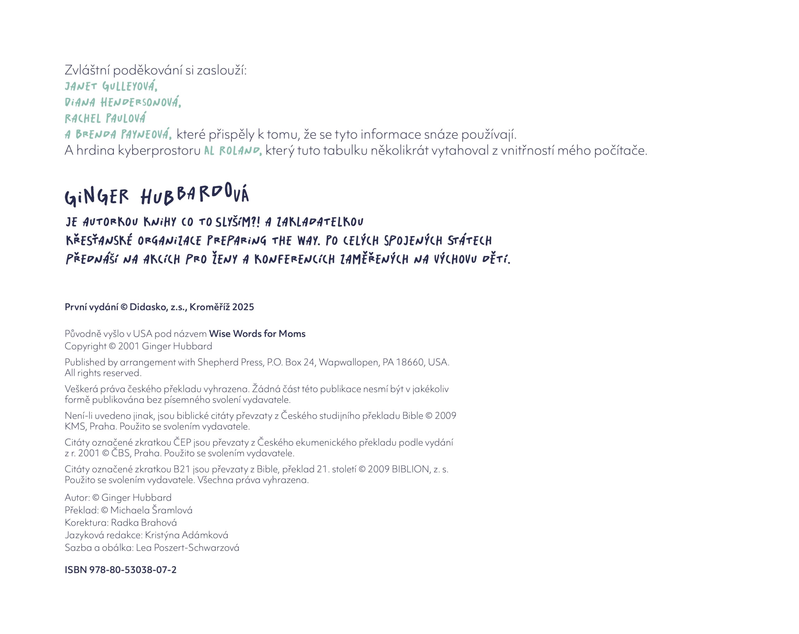 GINGER HUBBARDOVÁ je oblíbená přednášející a spisovatelka, jejíž knihy získaly různá ocenění. Po celých Spojených státech přednáší na rodičovských konferencích, seminářích pro maminky a akcích organizací podporujících domácí vzdělávání. Dvě ze svých čtyř dětí (nyní již dospělých) vzdělávala doma. V současné době žije s manželem v Alabamě. Více informací najdete na webových stránkách www.GingerHubbard.com. Do češtiny vyšla její kniha Co to slyším?!, se kterou jsou Moudrá slova pro maminky kompatibilní.