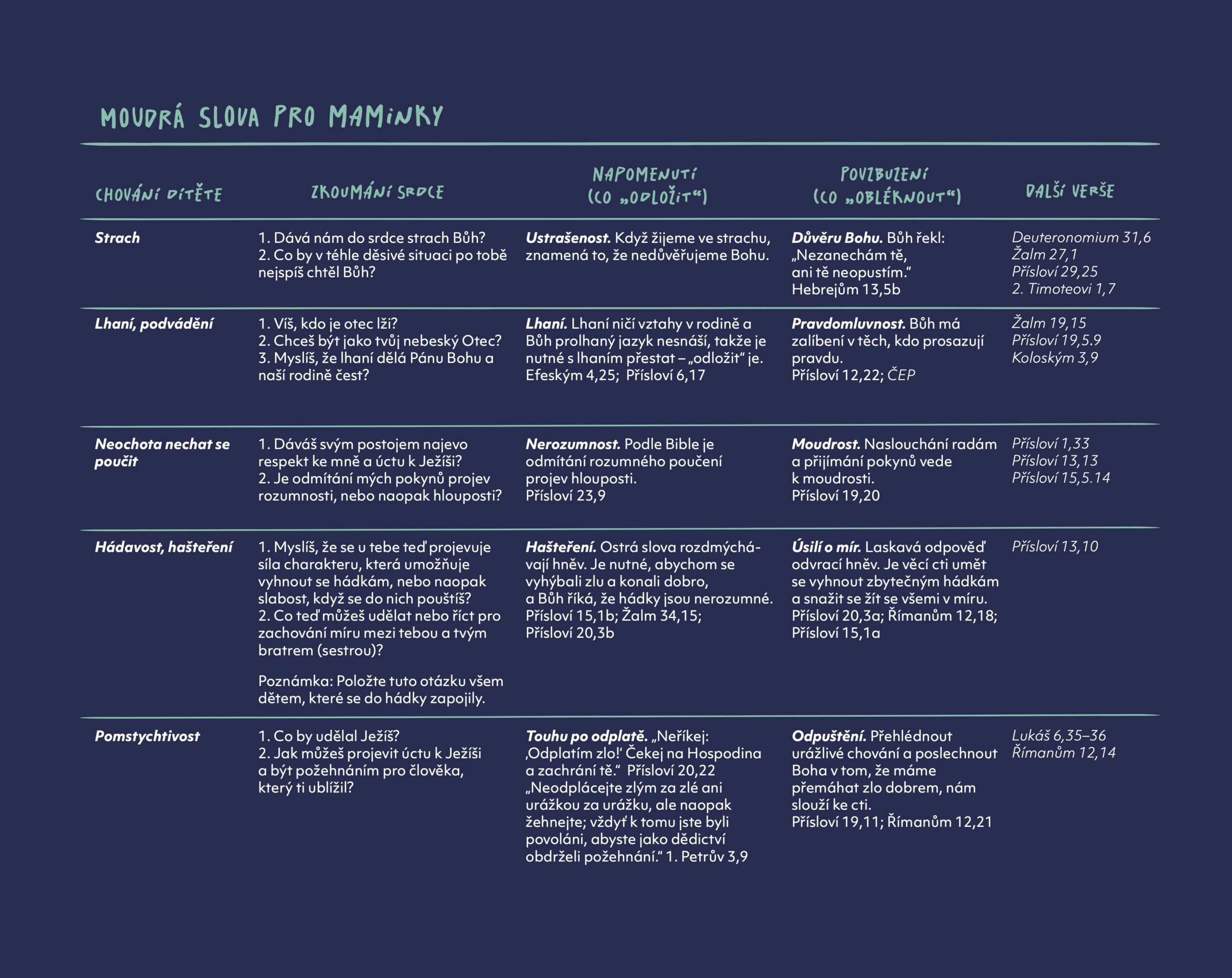 V tabulce Moudrá slova pro maminky najdete odpověď na otázku: „Jakou pasáž z Písma mám použít, abych se při řešení výchovného problému u dětí nezaměřovala pouze na odstranění nevhodného chování, ale dokázala se dotknout jejich srdce?