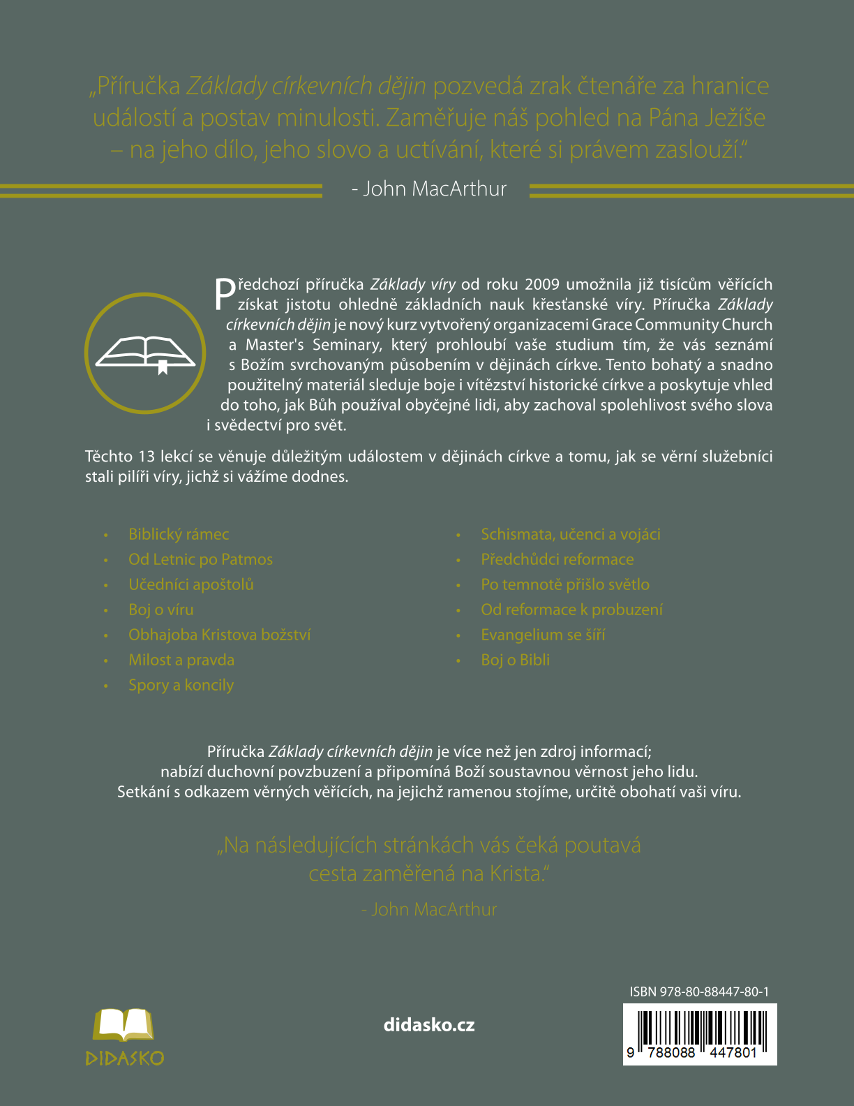 Předchozí příručka Základy víry od roku 2009 umožnila již tisícům věřících získat jistotu ohledně základních nauk křesťanské víry. Příručka Základy církevních dějin je nový kurz vytvořený Grace Community Church a Master’s Seminary, který prohloubí vaše studium tím, že vás seznámí s Božím svrchovaným působením v dějinách církve. Tento bohatý a snadno použitelný materiál sleduje boje i vítězství historické církve a poskytuje vhled do toho, jak Bůh používal obyčejné lidi, aby zachoval spolehlivost svého slova i svědectví pro svět.
